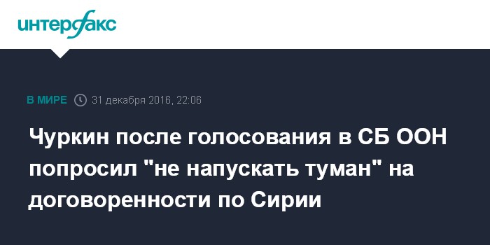 Москва. 31 декабря. INTERFAX.RU - Постоянный представитель РФ при ООН Виталий Чуркин попросил отдельных членов Совета Безопасности "не напускать туман" на достигнутые договоренности по Сирии усилиями России и Турции.