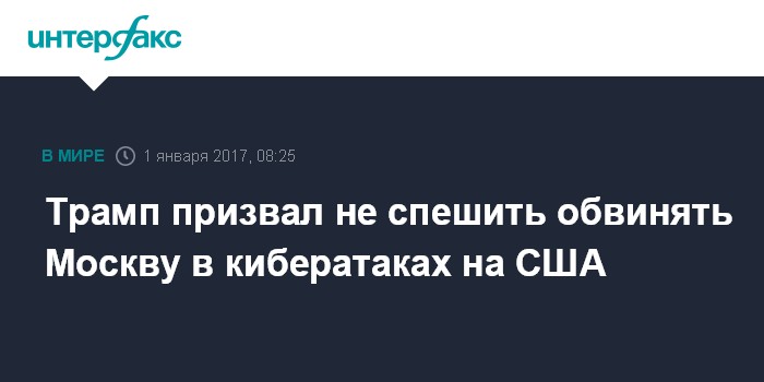 Москва. 1 января. INTERFAX.RU - Избранный президент США Дональд Трамп заявил, что не стоит спешить с обвинениями в адрес России в связи с кибератаками против США во время президентской гонки.