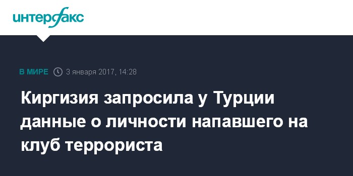 Москва. 3 января. INTERFAX.RU - Государственный комитет национальной безопасности (ГКНБ) Киргизии направил в Турцию запрос для подтверждения информации о возможной причастности гражданина республики к теракту в ночном клубе в Стамбуле, сообщил "Интерфаксу" во вторник официальный представитель ГКНБ Рахат Сулайманов.