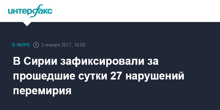 Москва. 3 января. INTERFAX.RU - В Сирии за прошедшие сутки зафиксировано 27 нарушений режима прекращения огня со стороны вооруженных формирований, сообщает во вторник Минобороны России.
