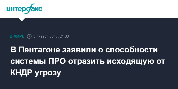 Москва. 3 января. INTERFAX.RU - В Пентагоне убеждены, что американская система ПРО сможет отразить угрозу, исходящую из Северной Кореи, заявил пресс-секретарь Пентагона Питер Кук.