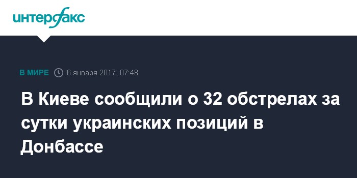 Москва. 6 января. INTERFAX.RU - За прошедшие утки ополченцы 32 раза открывали огонь по позициям украинских военнослужащих в Донбассе, сообщают в Киеве.