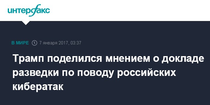 Москва. 7 января. INTERFAX.RU - Избранный президент США Дональд Трамп рассказал агентству Associated Press, что "многое понял" из доклада американской разведки на тему кибератак, которые якобы организованы по прямому приказу президента Владимира Путина. При этом Трамп отказался признавать вмешательство России в процесс выборов президента США.
