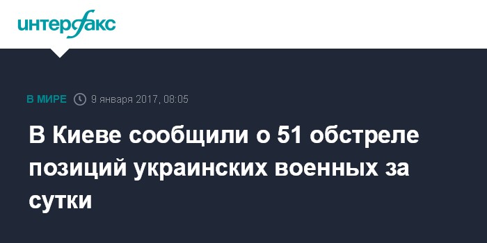 Москва. 9 января. INTERFAX.RU - За прошедшие сутки ополченцы в Донбассе 51 раз открывали огонь по позициям военнослужащих Вооруженных сил Украины, сообщает в понедельник пресс-служба штаба силовой операции.