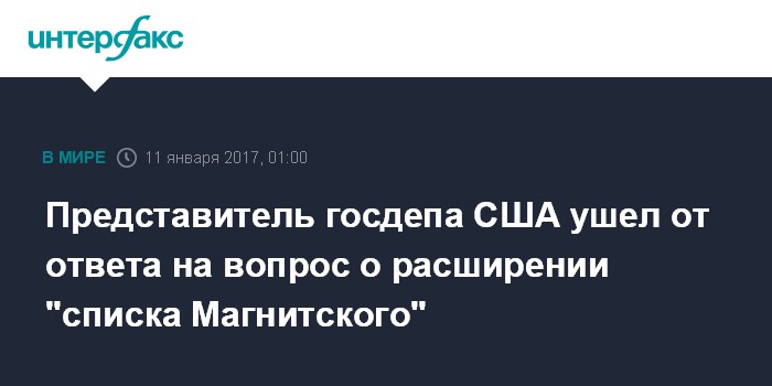 "Во всех случаях внесения в санкционные списки правительство США опирается на множество достоверных источников информации. (Действующая администрация - ИФ) продолжит изучать этот и другие случаи, связанные с грубым нарушением прав человека, чтобы определить, есть ли у нас достаточно информации о том, что другие лица подпадают под критерии акта Магнитского", - сказал он, отвечая на вопрос о том, будут ли вноситься в санкционный "список Магнитского" новые лица, включая высшее руководство РФ.