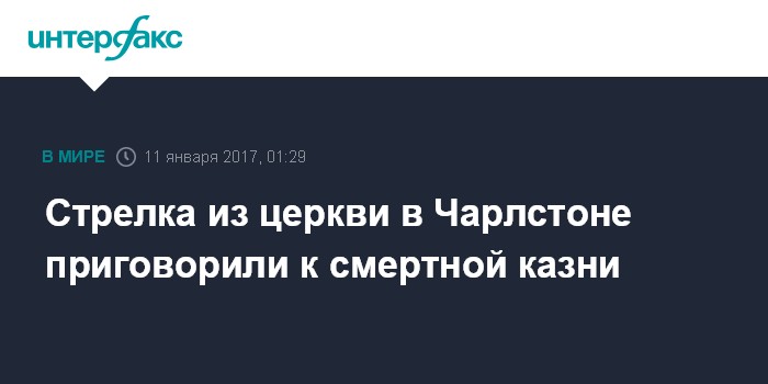 Москва. 11 января. INTERFAX.RU - Суд присяжных единогласно приговорил к смерти Дилана Руфа, в июне 2015 года устроившего стрельбу в методистской афроамериканской церкви в Чарлстоне, Южная Каролина, в результате которой погибли девять человек, сообщает во вторник CNN.