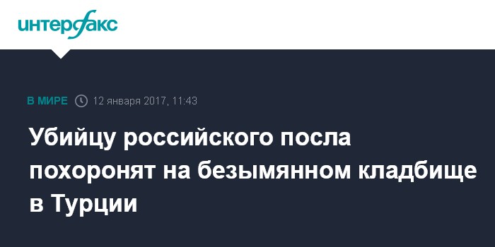 Москва. 12 января. INTERFAX.RU - Убийца посла РФ в Турции Андрея Карлова Мевлют Мерт Алтынташ, ликвидированный местным спецназом, будет похоронен на безымянном кладбище в Анкаре, сообщает в четверг агентство "Анадолу".