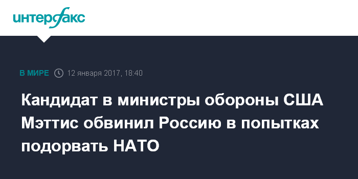 Москва. 12 января. INTERFAX.RU - Претендент на пост главы Пентагона Джеймс Мэттис обвинил Россию в попытках подорвать НАТО.