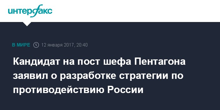 Москва. 12 января. INTERFAX.RU - Кандидат на пост главы министерства обороны США Джеймс Мэттис заявил, что он вместе со своими подчиненными планирует выработать проект стратегии для противостояния России на мировой арене.