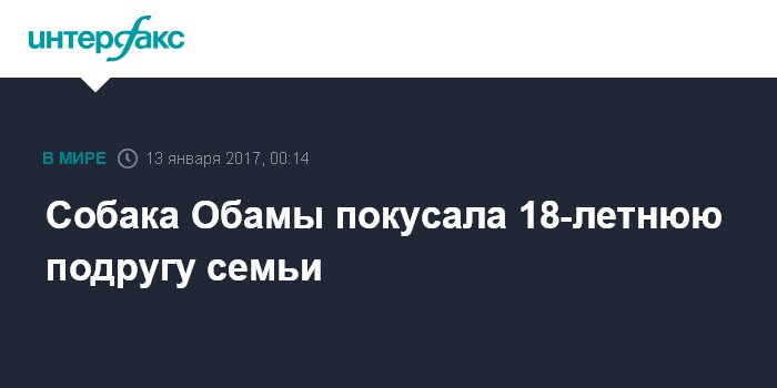 Москва. 13 января. INTERFAX.RU - Собака президента США по кличке Санни укусила 18-летнюю девушку, друга четы Обама, за лицо. Об этом сообщило издание TMZ.