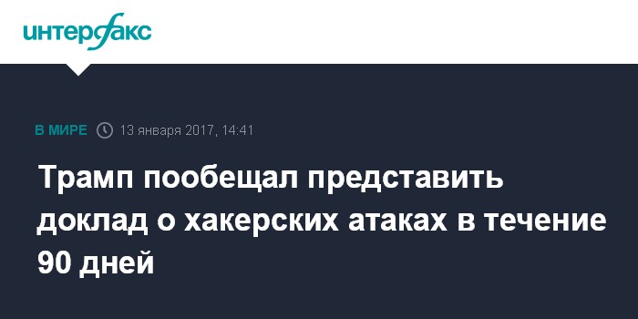 Москва. 13 января. INTERFAX.RU - Избранный президент США Дональд Трамп пообещал в течение 90 дней представить доклад, в котором будут рассмотрены выдвинутые против России обвинения в хакерских атаках в США во время минувших президентских выборов.