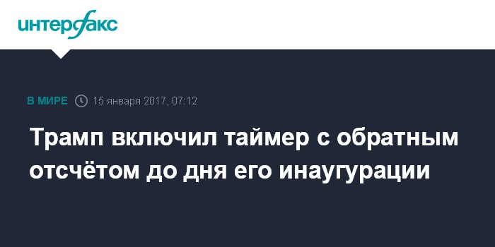 Москва. 15 января. INTERFAX.RU - Обратный отсчёт времени до инаугурации избранного президента США Дональда Трампа включен на его личной странице в Фейсбуке. Первый пост из серии под стандартным для республиканца хэштегом #MAGA (Make America Great Again) уже собрал более 200 тыс. лайков.