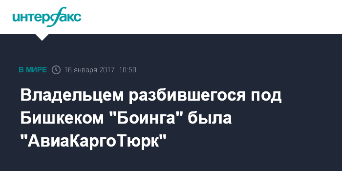 Москва. 16 января. INTERFAX.RU - Разбившийся недалеко от киргизского аэропорта "Манас" грузовой самолет "Боинг 747-400" принадлежал авиакомпании "АвиаКаргоТюрк" (АСТ) и был арендован Turkish Airlines, уточнили в понедельник "Интерфаксу" в правительственном штабе по изучению причин катастрофы.