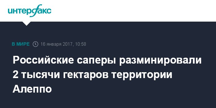 Москва. 16 января. INTERFAX.RU - Российские саперы разминировали около 2 тысяч гектаров территории Алеппо, обезврежены более 24 тыс. боеприпасов, сообщил начальник международного противоминного центра Вооруженных сил РФ полковник Игорь Михайлик.