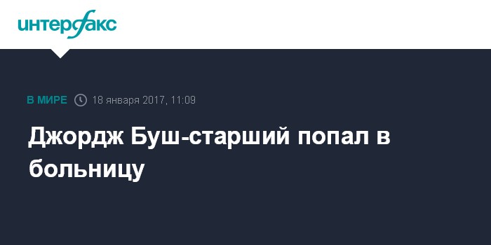 Москва. 18 января. INTERFAX.RU - Экс-президент США 92-летний Джордж Буш-старший был госпитализирован в Хьюстоне, штат Техас, по неназванным причинам, сообщило в среду американское телевидение со ссылкой на представителя бывшего главы государства Джин Бекер.