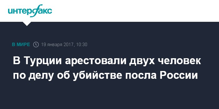 Москва. 19 января. INTERFAX.RU - Суд столицы Турции Анкары арестовал двух человек, задержанных в рамках расследования убийства посла РФ в Турции Андрея Карлова, сообщает в четверг Анатолийское агентство новостей.