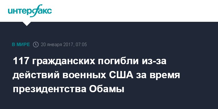 Москва. 20 января. INTERFAX.RU - По данным американской разведки, за время президентства Барака Обамы в различных странах мира жертвами американских действий стали 117 гражданских лиц, сообщило в пятницу агентство Associated Press.