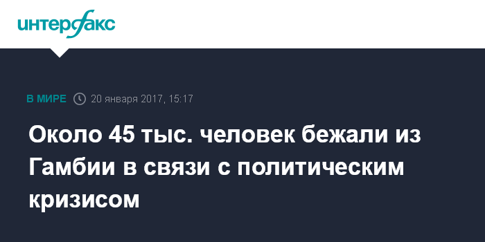Москва. 20 января. INTERFAX.RU - Около 45 тысяч человек бежали из Гамбии в Сенегал в связи с разразившимся в стране политическим кризисом, сообщает в пятницу управление Верховного комиссара ООН по делам беженцев.