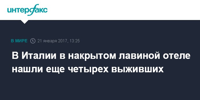Москва. 21 января. INTERFAX.RU - Спасатели нашли еще четырех человек, выживших после схода снежной лавины на отель Rigopiano в горном регионе Абруццо в Италии, передает в субботу агентство Associated Press.