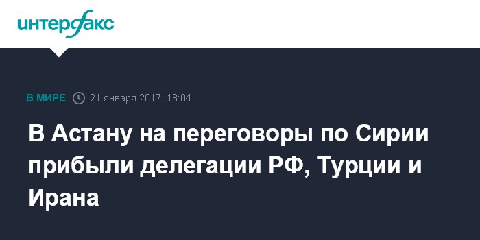 Москва. 21 января. INTERFAX.RU - Делегации России, Турции и Ирана прибыли в Казахстан для участия в межсирийских переговорах в Астане.