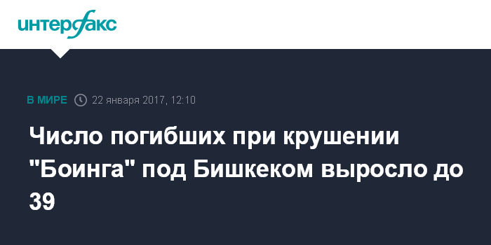 Москва. 22 января. INTERFAX.RU - Количество погибших при крушении грузового "Боинга 747-400", упавшего 16 января на дачный поселок рядом с аэропортом "Манас", увеличилось до 39 человек, сообщили в воскресенье в Минздраве Киргизии.