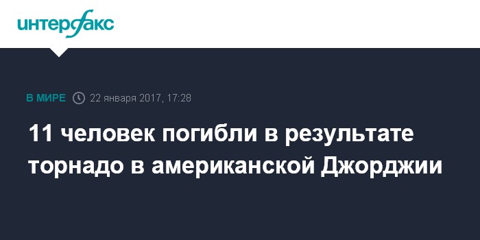 Москва. 22 января. INTERFAX.RU - Не менее 11 человек стали жертвами мощного торнадо в американском штате Джорджия, сообщило в воскресенье агентство Associated Press. Еще 23 пострадали.