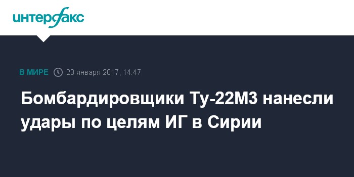 Москва. 23 января. INTERFAX.RU - Шесть бомбардировщиков Ту-22М3 нанесли удары по целям "Исламского государства" (запрещено в России) в районе сирийского города Дейр-эз-Зор, сообщает Минобороны РФ.