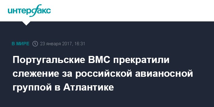Москва. 23 января. INTERFAX.RU - Португальские военные корабли прекратили слежение за авианосной ударной группой Северного флота, возвращающейся на базу в Североморск, после ее выхода из вод эксклюзивной экономической зоны страны на Атлантике. Об этом сообщило в понедельник командование ВМС страны.