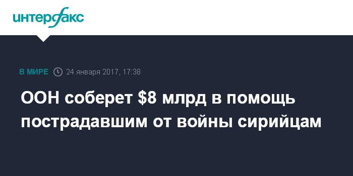 Москва. 24 января. INTERFAX.RU - В ООН заявили, что организации потребуется $8 млрд для оказания жизненно необходимой помощи миллионам сирийцев как на родине, так и беженцам, бежавшим в соседние страны, сообщают во вторник западные СМИ. "Кризис в Сирии остается самым сложным, неопределенным и жестоким в мире", - цитируют СМИ слова заместителя генсека ООН Стивен О'Брайен.