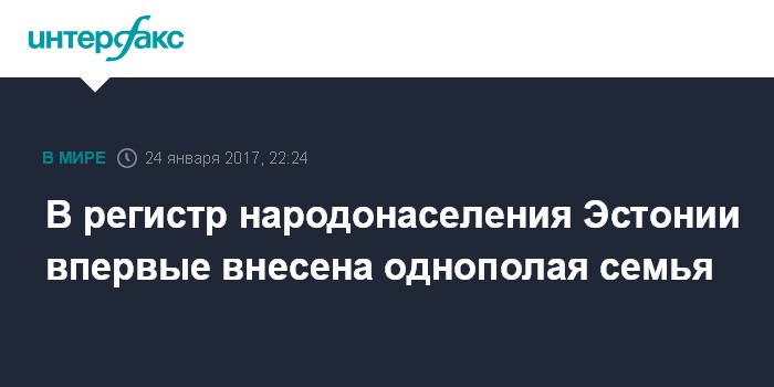 Москва. 24 января. INTERFAX.RU - В Эстонии во вторник в регистр народонаселения страны впервые была внесена однополая семья.