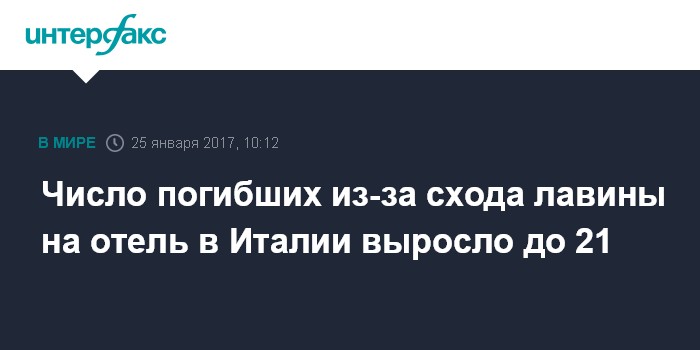 Москва. 25 января. INTERFAX.RU - Число жертв схода лавины на отель Rigopiano в горном регионе Абруццо в Италии увеличилось до 21 человека, сообщает в среду агентство Associated Press.