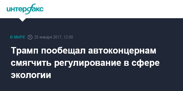 Москва. 25 января. INTERFAX.RU - Президент США Дональд Трамп, встречавшийся во вторник с главами "детройтской тройки" автомобилестроительных концернов, заявил, что намерен принять меры для смягчения регулирования в сфере окружающей среды, понизить корпоративные налоги, а также придерживаться стратегии, благоприятной для местных производителей, пишет газета The Wall Street Journal.