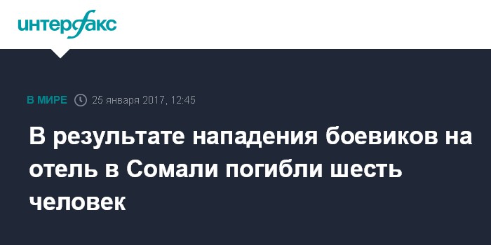 Москва. 25 января. INTERFAX.RU - В результате нападения боевиков на отель в столице Сомали Могадишо в среду погибли по меньшей мере шесть человек и четыре были ранены. Об этом сообщает агентство The Associated Press со ссылкой на местную полицию.