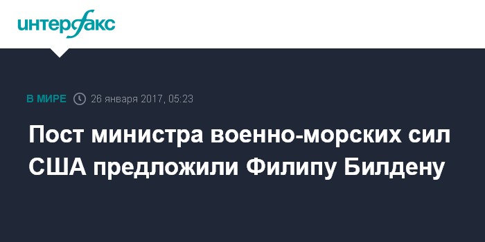 Москва. 26 января. INTERFAX.RU - Президент США Дональд Трамп видит министром военно-морских сил (ВМС) Филипа Билдена и намерен выдвинуть его кандидатуру на утверждение сенатом в этой должности, сообщил в среду Белый дом.