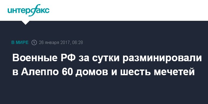 Москва. 26 января. INTERFAX.RU - Российские военнослужащие Международного противоминного центра продолжают гуманитарное разминирование домов, улиц и социально значимых объектов в восточном Алеппо, сообщает российский Центр по примирению враждующих сторон в Сирии.