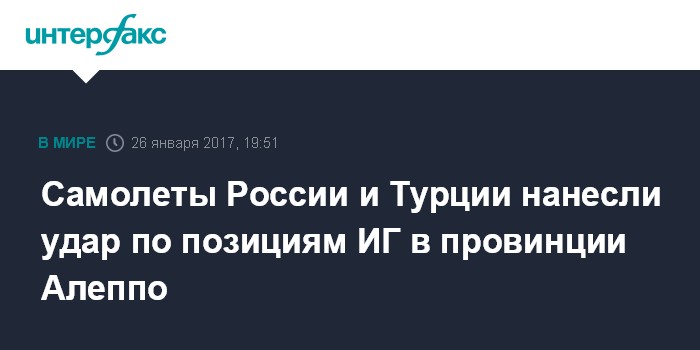 Москва. 26 января. INTERFAX.RU - Боевая авиация России и Турции в четверг нанесла удар по террористической группировке ИГ (запрещена в РФ) в районе населенного пункта Эль-Баб в сирийской провинции Алеппо, сообщили "Интерфаксу" в Минобороны России.