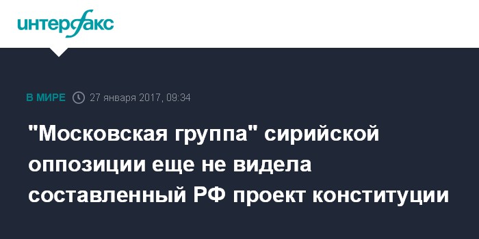 Москва. 27 января. INTERFAX.RU - Так называемая "московская группа" сирийской оппозиции пока не получала проект Конституции Сирии, подготовленный российскими специалистами.