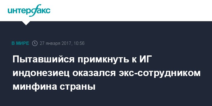 Москва. 27 января. INTERFAX.RU - Гражданин Индонезии, задержанный за предполагаемые связи с террористической группировкой "Исламское государство" (ИГ, запрещена в РФ), оказался бывшим сотрудником министерства финансов страны, сообщают в пятницу западные СМИ.