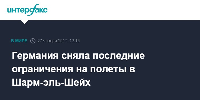 Москва. 27 января. INTERFAX.RU - Авиационные власти Германии сняли последние ограничения на полеты в Шарм эль-Шейх, сообщает в пятницу Ассоциация туроператоров России (АТОР).