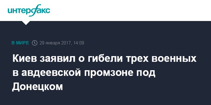 Москва. 29 января. INTERFAX.RU - Трое военнослужащих Вооруженных сил Украины погибли в воскресенье утром в результате артиллерийского обстрела и штурмовых действий противника у авдеевской промзоны (Донецкая область), сообщает представитель Министерства обороны Украины Александр Мотузяник.