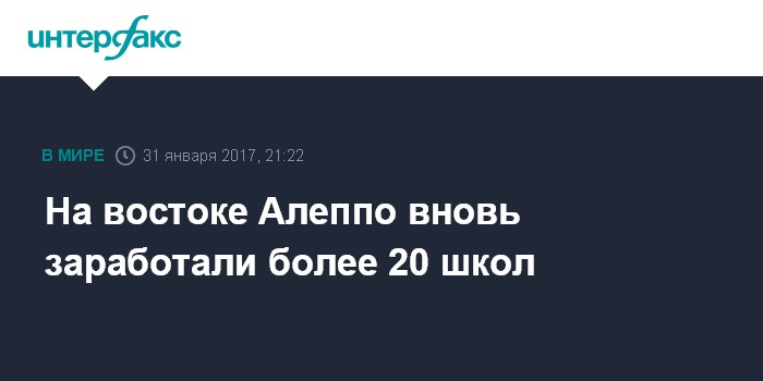 Москва. 31 января. INTERFAX.RU - Не менее 23 начальных школ в восточной части сирийского города Алеппо вновь открыли свои двери для учеников, сообщили во вторник в ООН. Отмечается, что 6,5 тыс. детей получили возможность вернуться за школьные парты благодаря Детскому фонду ООН (ЮНИСЕФ).