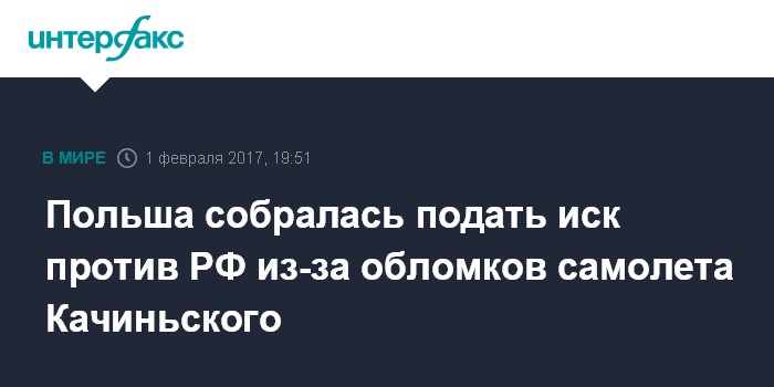 Москва. 1 февраля. INTERFAX.RU - Правительство Польши планирует привлечь Россию к ответственности в Международном уголовном суде (МУС) в Гааге из-за отказа Москвы передать Польше обломки самолета Ту-154, потерпевшего крушение под Смоленском в 2010 году, сообщает Associated Press.