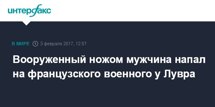 Москва. 3 февраля. INTERFAX.RU - Район около музея Лувр в Париже оцеплен в пятницу после того как неизвестный, вооруженный ножом, попытался напасть на военнослужащего, сообщает французский телеканал BFM.