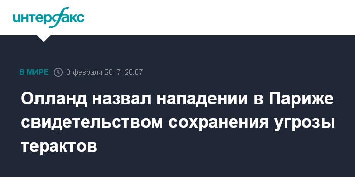 Москва. 3 февраля. INTERFAX.RU - Президент Франции Франсуа Олланд заявил, что нападение на военных в Париже свидетельствует, что угроза терроризма остается.