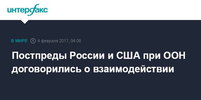 Москва. 4 февраля. INTERFAX.RU - Постоянные представители России и США при ООН Виталий Чуркин и Никки Хейли намерены тесно взаимодействовать во Всемирной организации, сообщает российская миссия при ООН по их итогам их первой встречи в резиденции постпреда РФ.