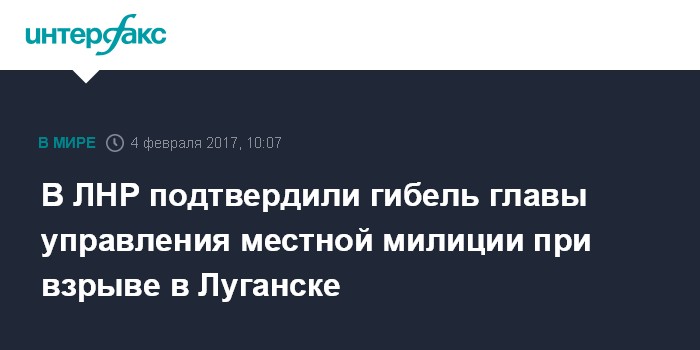 Москва. 4 февраля. INTERFAX.RU - Начальник управления народной милиции самопровозглашенной Луганской народной республики погиб при взрыве автомобиля в Луганске, сообщает в субботу Луганский информационный центр.