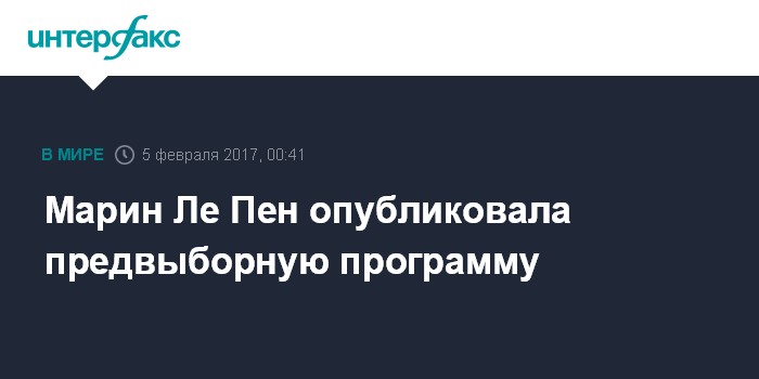 Москва. 5 февраля. INTERFAX.RU - Кандидат в президенты Франции Марин Ле Пен в субботу опубликовала программу, с которой пойдет на выборы.