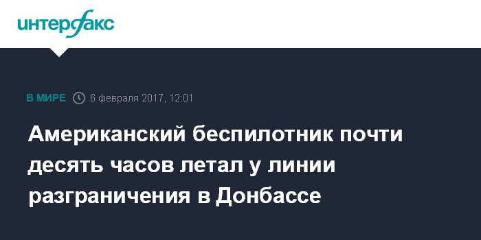Москва. 6 февраля. INTERFAX.RU - Стратегический беспилотный летательный аппарат (БЛА) ВВС США RQ-4A Global Hawk с позывным UAVGH000 совершил почти 10-часовой разведывательный полет вдоль линии разграничения в Донбассе, сообщили западные сайты, отслеживающие полеты военной авиации.