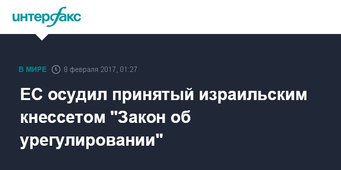 "Этот закон пересекает новый и опасный порог, узаконивая в соответствии с израильским законодательством изъятие прав собственности палестинцев и, по сути, разрешая конфискацию частной палестинской земли на оккупированной территории", - говорится в заявлении высокого представителя ЕС по иностранным делам, распространенном в Брюсселе.