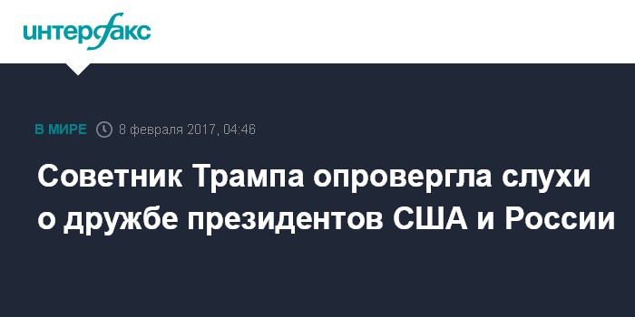Москва. 8 февраля. INTERFAX.RU - Советник президента США Дональда Трампа Келлин Конуэй опровергла слухи о том, что его и главу российского государства Владимира Путина связывают дружеские отношения.